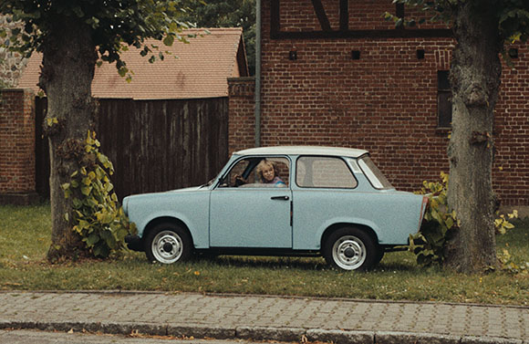 “In editing, we resolved this with haunting, recurring fragments that appear three times throughout the film. These brief memory fragments let us enter Irm’s mind without taking on her perspective as we do with the main characters, offering insight into her emotional world. One example, on her birthday: the village plays a prank on her, the Trabant parked between two trees. Irm discovers it, gets in the car, puzzled. In voiceover, Angelika says their father always tried to make her laugh, but it never worked. As everyone sings and birthday candles burn, champagne splashes against the window, and Irm sits frozen in her car, as if turned to stone. Angelika notices, the sound disappears, a crackling begins. Laughing villagers, clapping, blurred figures. Irm’s disturbed. Cut. An eel in murky water. Cut. Irm’s frozen face. Cut. A group of women enter the river. Cut. Irm. Cut. Erika pauses in the water, turns and looks directly at the camera. Cut.”