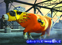 It's called misdirection (tricking viewers with its ominous mood) Janimation founder and chief creative director Steve Gaconnier points out, and he was delighted to be involved in the project. Stylistically, the :30's moody opening draws you into a threatening environment of urban decay redolent of an X-Men feature, including the bleak intonations of the narrator's line, "In a world driven by hunger..." Then the spot lurches into parody as seven of the "Cow Superheroes" appear posed together on all fours positioned in a phalanx. Janimation then singled out three of the cows with solo cutaways - "The Swatter," "The Gristle Missile" and "Cold Cuts."