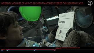 Eoin Greenham: “Another interesting part of the collaboration was our use of VFX assets in the conversion process. We used LIDAR scans of the capsule sets, and cyber-scans of lead actress Sandra Bullock’s head from Framestore to produce depth mattes, and to model early stereo ‘design frames’, with a view to producing a ‘technically exact’ stereo image as a starting point for the conversion. But even this was not without its technical complications. Because the crew was dismantling and reassembling the set around the mono camera as it moved through the tight confines of the capsule set in its long takes, the LIDAR was not completely accurate. We had to rebuild the environment in order to produce the depth mattes, which we could then use to ensure the accuracy of the conversion, and a consistency of depth across all our shots.”