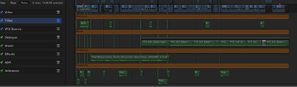 - Audio: Audio was organized into lanes with ‘track blockers’ (renamed titles). Roles were assigned based on audio type. XML was exported and then imported into X2Pro to create an AAC.