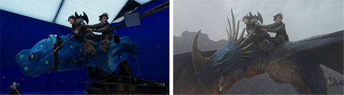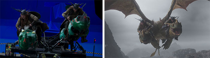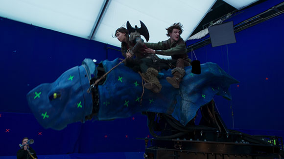 “We had a puppet for the whole of Toothless, minus his wings, based on the digital sculpt Framestore had created. This could be separated into sections depending on what the shot required. Often it would be just Tom and the head, which had a movable mouth and ear plates, as well as posable eyes. All of the other dragons were represented by heads, which were either handheld or mounted on backpack rigs, to mimic the long necks of the Zipplebacks, for example.