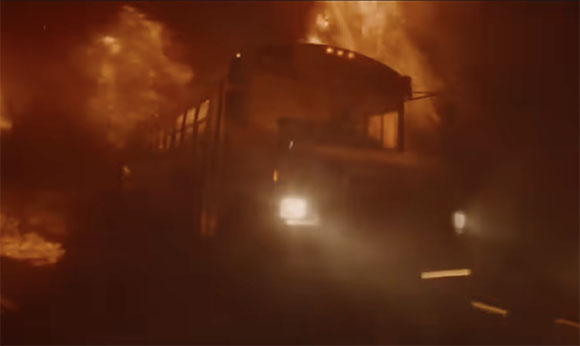 While visual effects are incorporated throughout the film, Noble points to a specific sequence at the end, when the school bus is racing down a hill and out of a heavily-forested area, just as the fire is about to envelope the vehicle. The scene’s movement and framing was shot practically, though imagery was later replaced with VFX.