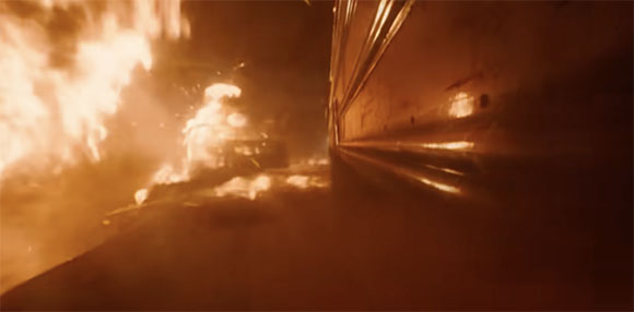 The scene ends with the bus reaching a clearing at the bottom of the hill, with the raging fire and smoke being left behind.